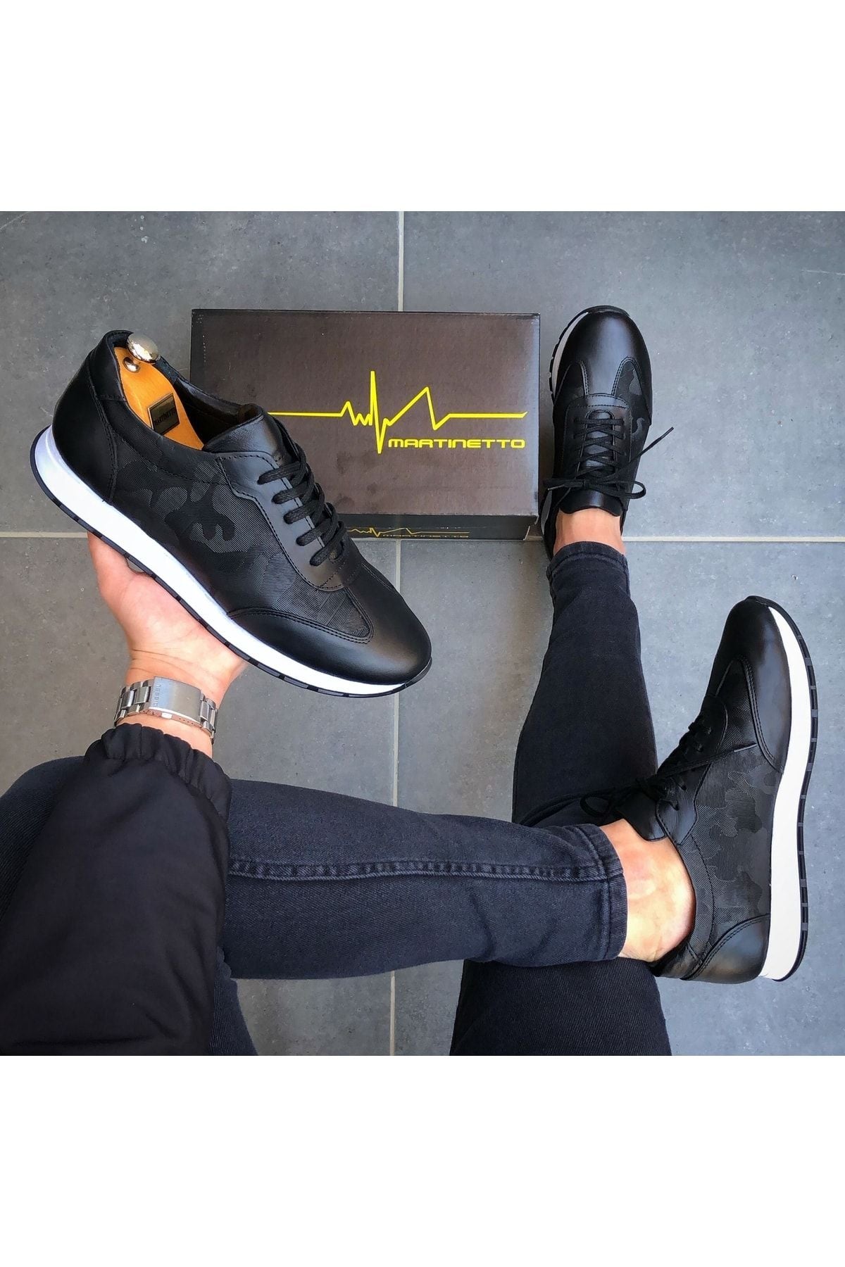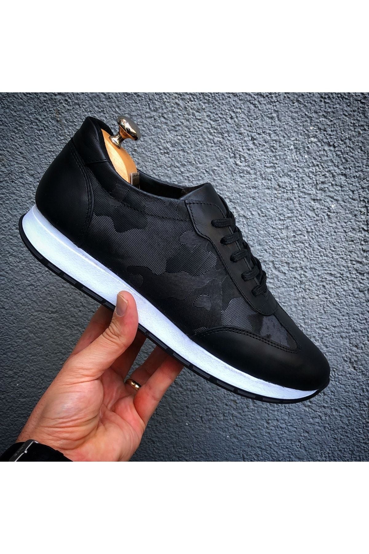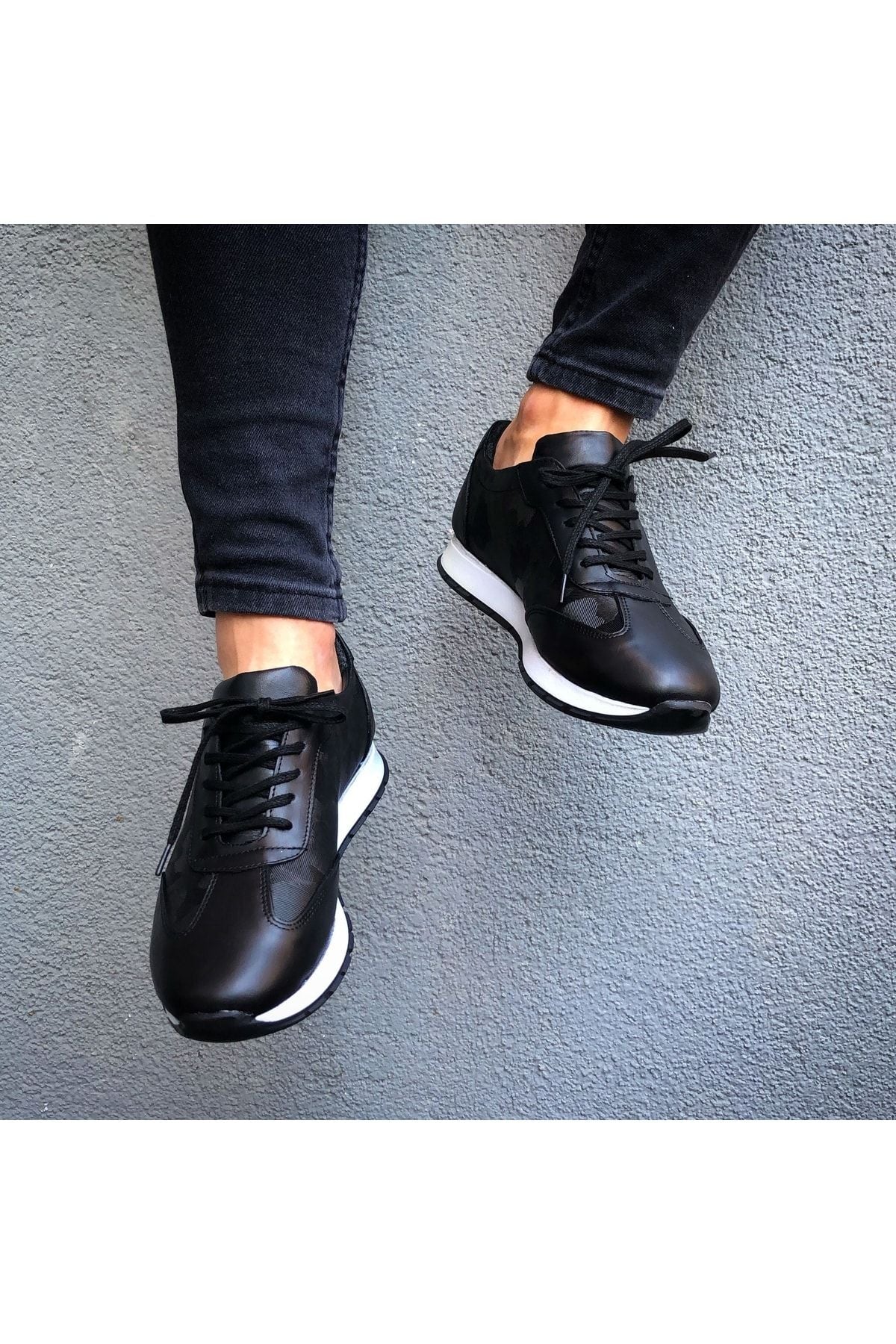 Hakiki Deri Siyah Kamuflaj Desen Siyah Günlük Erkek Ayakkabı