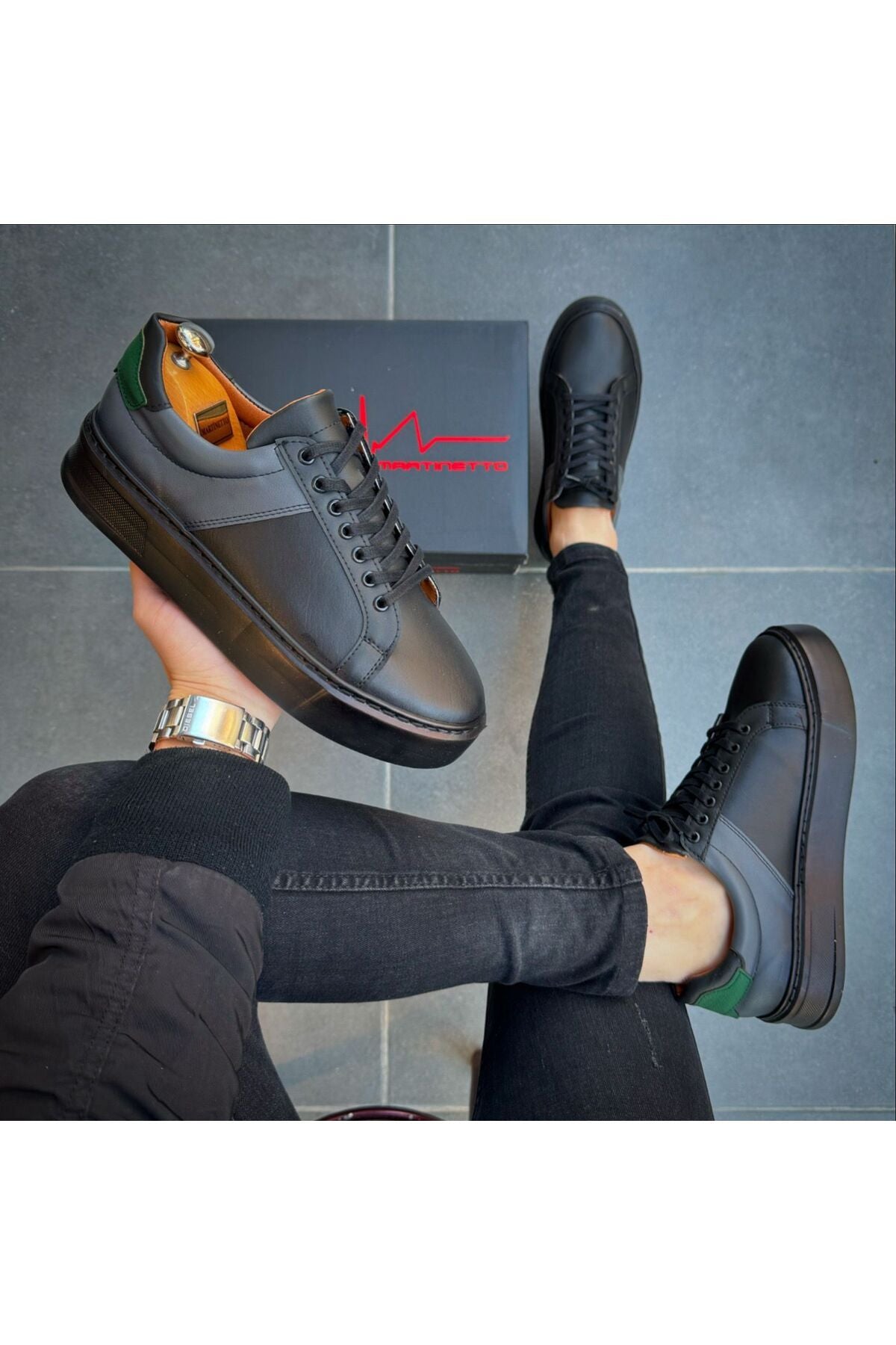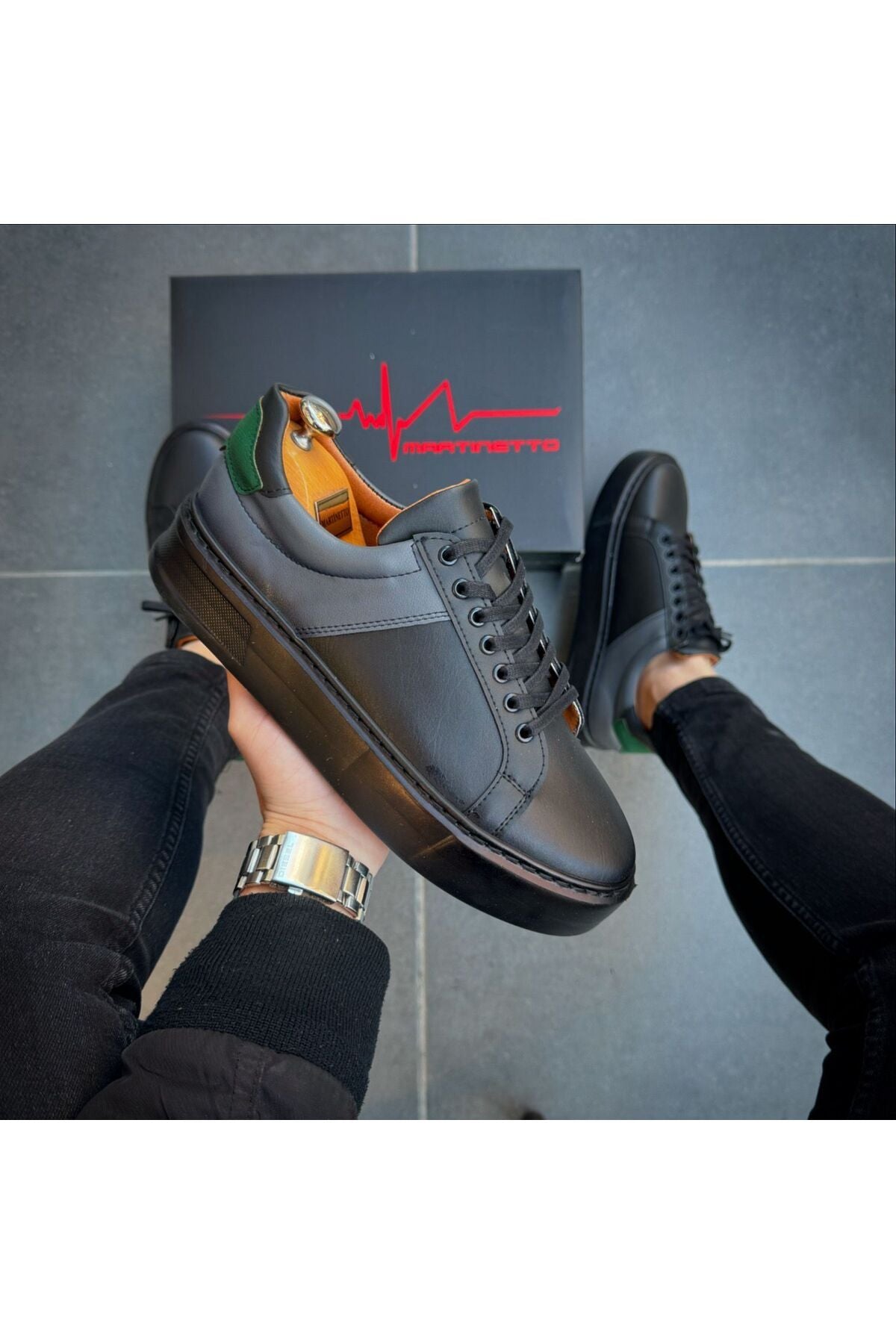 MARKA : MARTİNETTO DIŞ METERYAL : İTHAL SUNİ DERİ İÇ METERYAL : ANTİBAKTERİYEL İTHAL SUNİ DERİ TABAN TEKNOLOJİSİ : Vucüt ağırlığından gelen basıncı dengeli bir şekilde absorbe eden EVA malzeme TABAN YÜKSEKLİĞİ : BURUN KISMI 3 CM TOPUK KISMI 4 CM ORTALAMA AĞIRLIK : 850 gr ( 1 çift kutu dahil) Modaya yön veren tasarımcılarımızın çizimlerini ,birbirinden yetenekli ayakkabı ustalarının el emeği ile Türkiye'de üretilmiştir.; %100 el imalatıdır arka kısmında gri parca topuk kısmında yeşil parca mevcuttur ÜRETİM YERİ : TÜRKİYE Görseldeki erkek mankenin ayak bedeni 40 numaradır.; Sade çizgileri ve zarif dokulu yapısıyla jean, şort , klasik pantolon, takım elbise ve aklınıza gelebilecek hemen hemen bütün giyim parçaları ile uyum sağlayarak stilinizi her ortamda mükemmel hale getirir